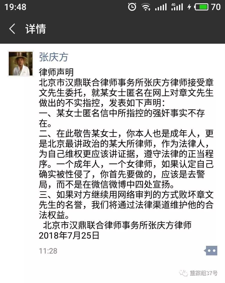 对此,章文委托北京市汉鼎联合律师事务所律师张庆方发布声明称,上述文章指控的强奸事实不存在。维权应讲证据,遵守法律正当程序。“若继续用网络审判的方式败坏章文先生的名誉,我们将通过法律渠道维护他的合法权益。”