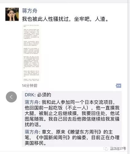 微信截图显示,蒋方舟在朋友圈发布小文的长文图片的下方评论说,自己和章文曾一起参加一个日本交流项目,回国前多人一起吃饭。“他一直摸我大腿,被制止之后继续摸,我要回住处,他试图尾随我。”在自己回去之后,仍继续接到章文发来骚扰的话。