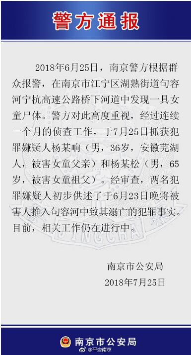 据了解,2018 年 6 月 25 日,南京警方根据群众报警,在南京市江宁区湖熟街道句容河宁杭高速公路桥下河道中发现一具女童尸体。警方对此高度重视,经过连续一个月的侦查工作,于 7 月 25 日抓获犯罪嫌疑人杨某响(男,36 岁,安徽芜湖人,被害女童父亲)和杨某松(男,65 岁,被害女童祖父)。经审查,两名犯罪嫌疑人初步供述了于 6 月 23 日晚将被害人推入句容河中致其溺亡的犯罪事实。目前,相关工作仍在进行中。
