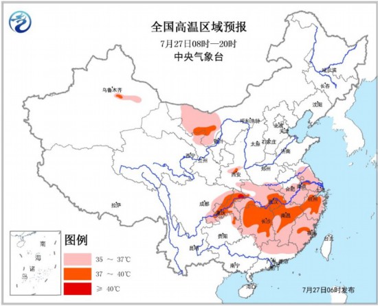 预计7月27日白天,内蒙古西部、陕西关中地区、四川盆地东部、重庆、江汉、江淮、江南等地最高气温有35~36℃,其中,内蒙古西部、陕西关中地区、重庆、湖北南部、湖南大部、江西中北部、浙江中西部、福建中部等地的部分地区最高气温可达37~39℃,重庆北部局地可达40℃以上。