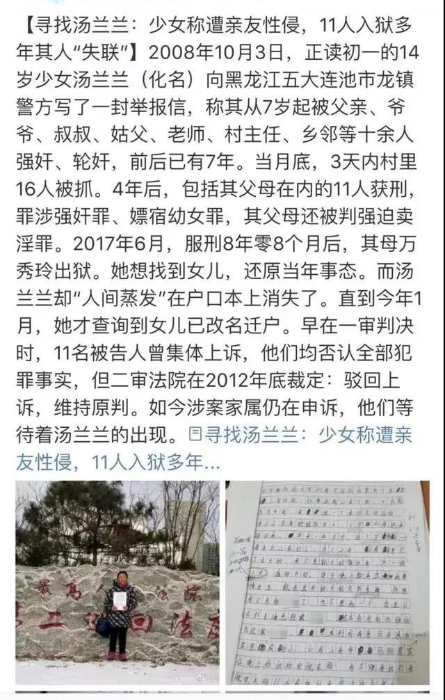 最后,根据黑龙江高院的说法,在此案发生后,遭受亲人非人凌辱的汤兰兰一度已经成功隐姓埋名,远离了之前的黑暗。可今年初媒体集中的报道,却再次给她的心灵造成了伤害。