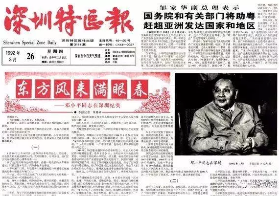 1992年3月26日《深圳特区报》头版发表长篇通讯《东方风来满眼春——邓小平同志在深圳纪实》