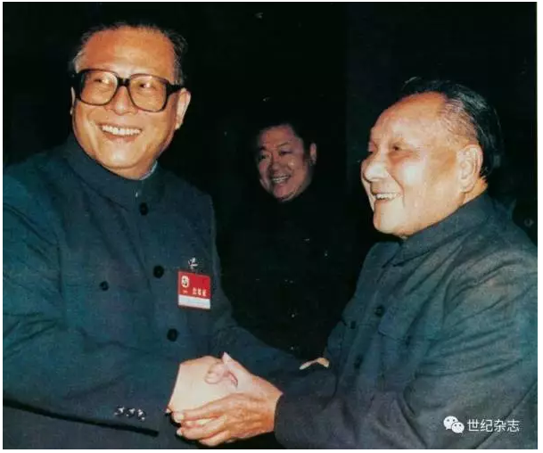 1992年10月,中共十四大期间,邓小平与江泽民在一起