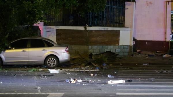 在发生碰撞事故的十字路口西南角,地面撒满了车体碎片。一辆道路清障车正将被撞变形的电动车和遮阳篷残骸拖离现场。现场一棵碗口粗的行道树被撞得连根拔起,旁边小区的一堵围墙被撞破损。