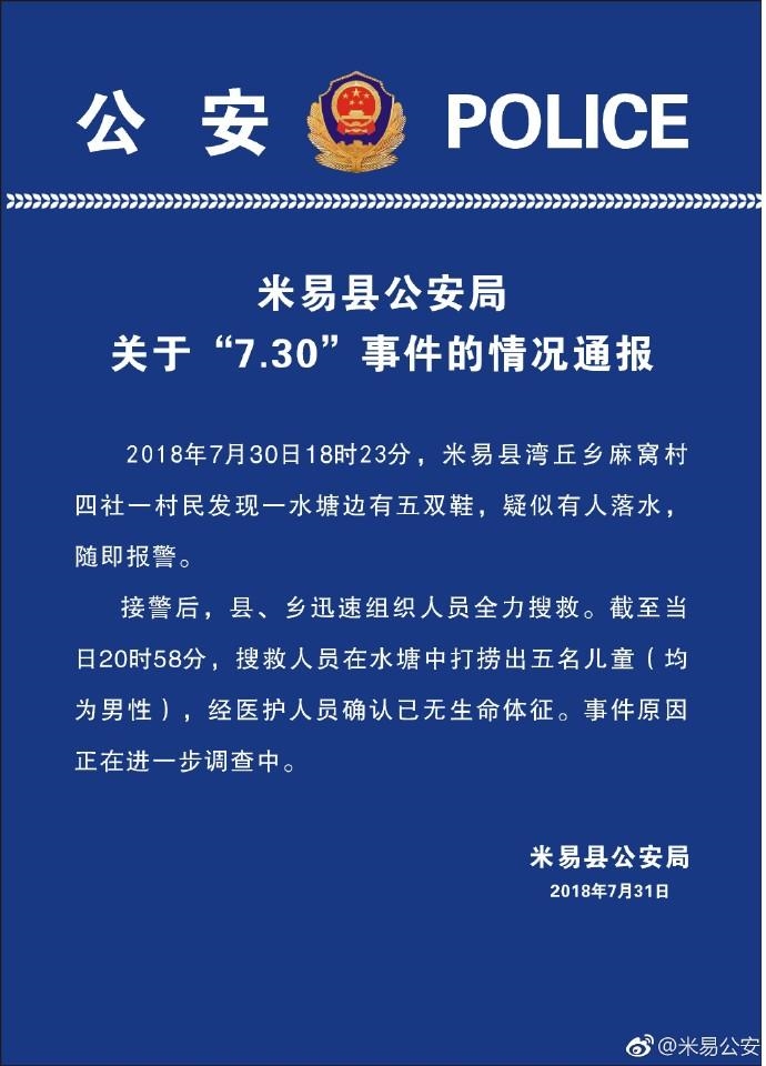 接警后,经全力搜救,截至当日20时58分,搜救人员在水塘中打捞出5名儿童(均为男性),经医护人员确认已无生命体征。事件原因正在进一步调查中。