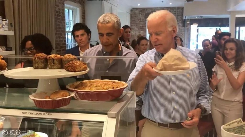 ▲7月31日,美国前总统奥巴马和前副总统拜登一起买面包。