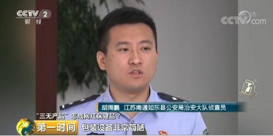 江苏南通如东县公安局治安大队副大队长 顾国栋:他们为了让消费者更加放心,他们做了防伪标志。这个防伪标志其实很简单,椭圆形的小标签,上面写着防伪两个字,底下再印着两个字,就这么回事了。