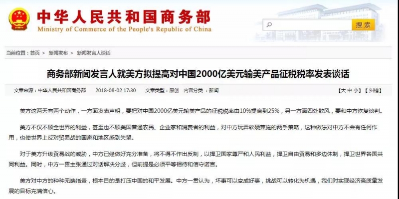 另据路透社8月2日报道,在特朗普政府提出对价值2000亿美元的中国商品征收更高的25%关税,试图通过强化施压以迫使中方让步之际,中国2日敦促美方回归理性。