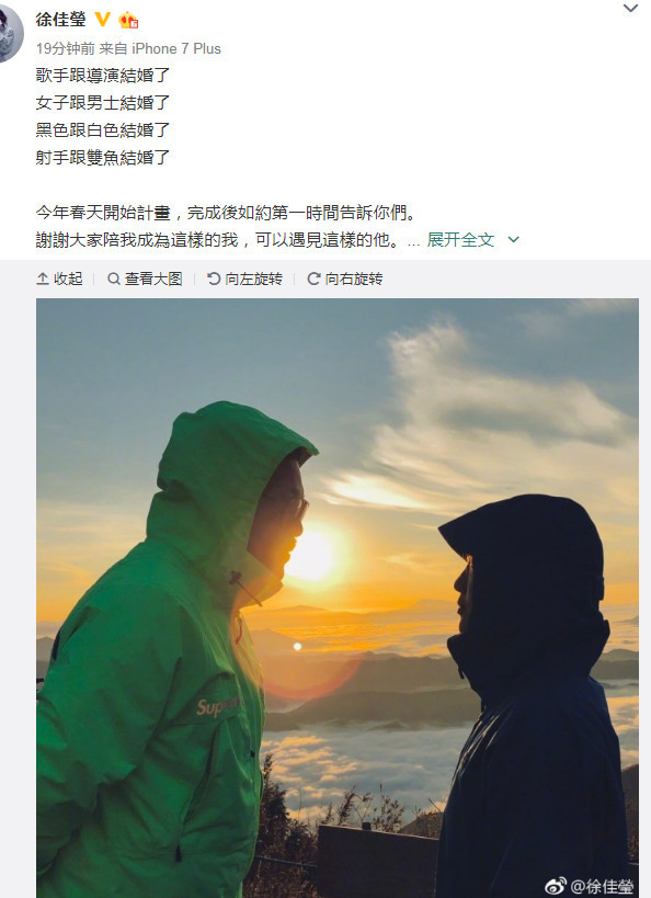原标题:徐佳莹晒照宣布结婚,男方是位导演,比她大11岁