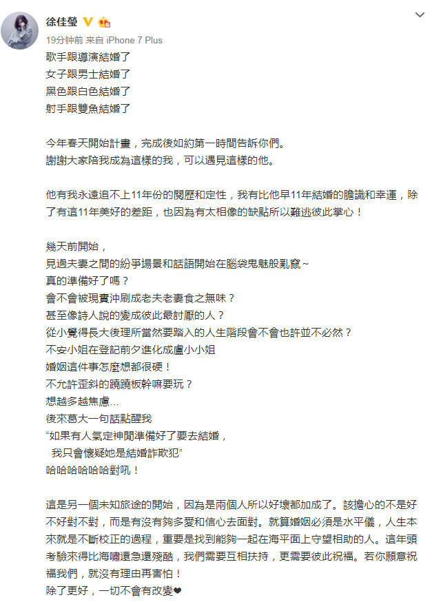徐佳莹透露,结婚是今年春天开始计划,完成后如约第一时间告诉大家。她还在微博感性发言:“他有我永远追不上11年份的阅历和定性,我有比他早11年结婚的胆识和幸运,除了有这11年美好的差距,也因为有太相像的缺点所以难逃彼此掌心!”