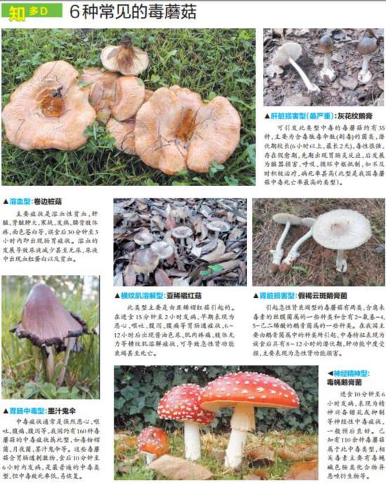 疾控专家提醒,一种毒蘑菇中可能含有多种毒素,一种毒素又可能存在于多种毒蘑菇中。毒蘑菇的主要毒素有:胃肠毒素、神经精神毒素、血液毒素、原浆毒素等。毒蘑菇中毒的临床表现因进食的毒蘑菇种类及其所含毒素不同有很大的差异,一般分肠胃型、神经精神型、溶血型、脏器损害型(肝、肾)等。(记者 叶祯 实习生 卢丽婷)