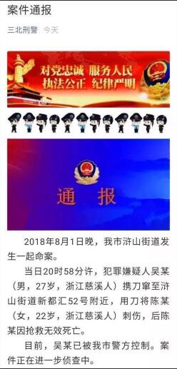 慈溪当地警方“三北刑警”发布通报:凶手已被控制,案件正在进一步侦查中。