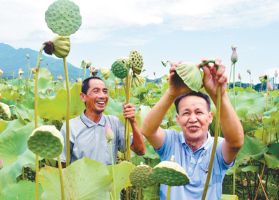 图为近日万载县岭东乡东山村5000亩莲花基地中,党员郭基福(右)和村民正在采摘莲蓬。