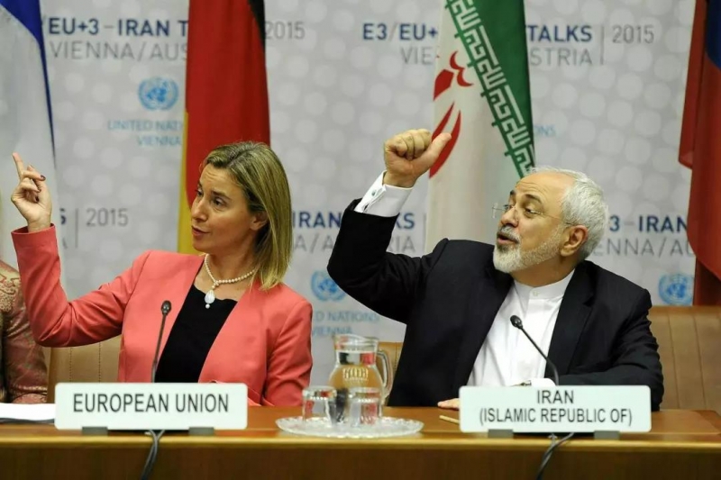 ▲资料图片:2015年7月14日,奥地利维也纳伊核谈判期间,欧盟外交和安全政策高级代表费代丽卡·莫盖里尼(左)与伊朗外交部长扎里夫一同出席新闻发布会。