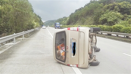 8月6日上午11时,广昆高速上,一辆面包车左后轮胎爆胎,车辆失控撞右边护栏侧翻在地 通讯员 潘洪江 摄
