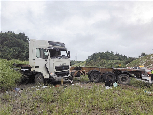 7月30日因雨天路滑,一辆半挂货车车速太快,转弯时打滑失控,在撞上中央护栏后冲出高速公路 通讯员 潘洪江 摄