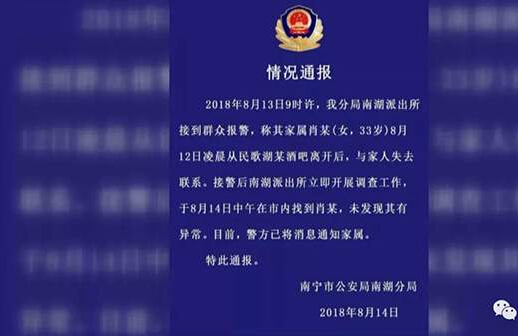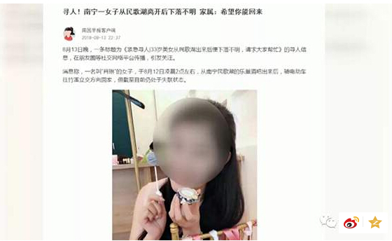 很多广西南宁市民都在微信朋友圈里转发一条寻人信息,让人揪心。信息上说,一名女子于8月12日凌晨两点左右,从南宁民歌湖的乐巢酒吧出来后,骑电动车往竹溪立交方向回家,之后就失踪了。8月14日下午,记者从南宁市公安局南湖公安分局了解到,这名女子已经找到了。这是8月11日晚上11点35分,当事女子的朋友圈里出现的一条小视频,地点显示是南宁上上酒吧,小视频配文:好久没来,感觉满血复活。之后,警方通过翻查失踪女子通话记录,发现女子随后又前往了民歌湖的另一家酒吧,离开酒吧之后她就失踪了。 根据天眼监控拍摄到的画面,这名女子最后出现的地点是在竹岭立交路口,而她的手机一直处于关机或无人接听状态。