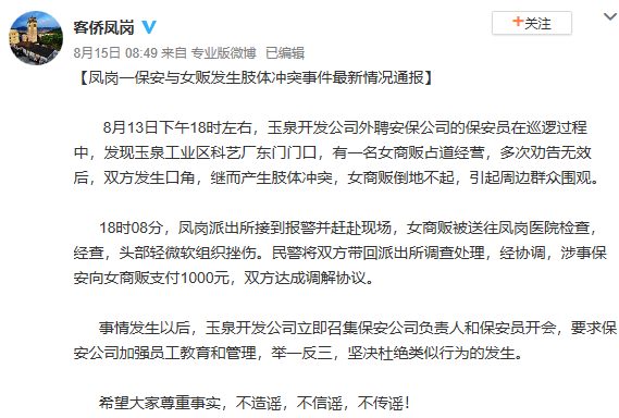 18时8分,凤岗派出所接到报警并赶赴现场,女商贩被送往凤岗医院检查。经查,女子头部轻微软组织挫伤。民警将双方带回派出所调查处理。经协调,涉事保安向女商贩支付1000元,双方达成调解协议。