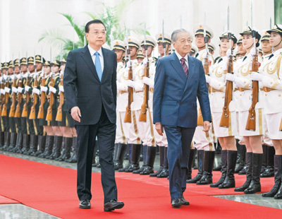 8月20日,国务院总理李克强在北京人民大会堂同来华进行正式访问的马来西亚总理马哈蒂尔举行会谈。这是会谈前,李克强在人民大会堂北大厅为马哈蒂尔举行欢迎仪式。