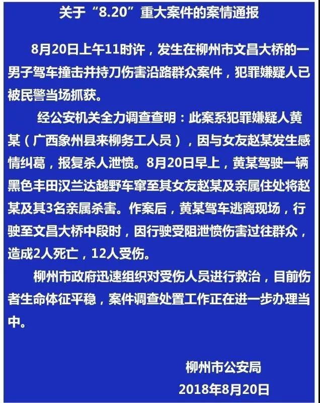 通报称,经公安机关全力调查查明:此案系犯罪嫌疑人黄某(广西象州县到柳州市务工人员),因与女友赵某发生感情纠葛,报复杀人泄愤。8月20日早上,黄某驾驶一辆黑色丰田汉兰达越野车窜至其女友赵某及亲属住处将赵某及其3名亲属杀害。作案后,黄某驾车逃离现场,行驶至文昌大桥中段时,因行驶受阻泄愤伤害过往群众,造成2人死亡,12人受伤。