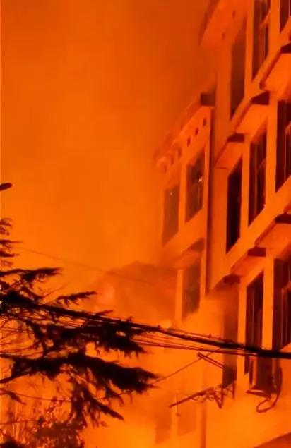 木材市场旁边的民房已经受到了波及,房间内冒出了浓浓的黑烟。
