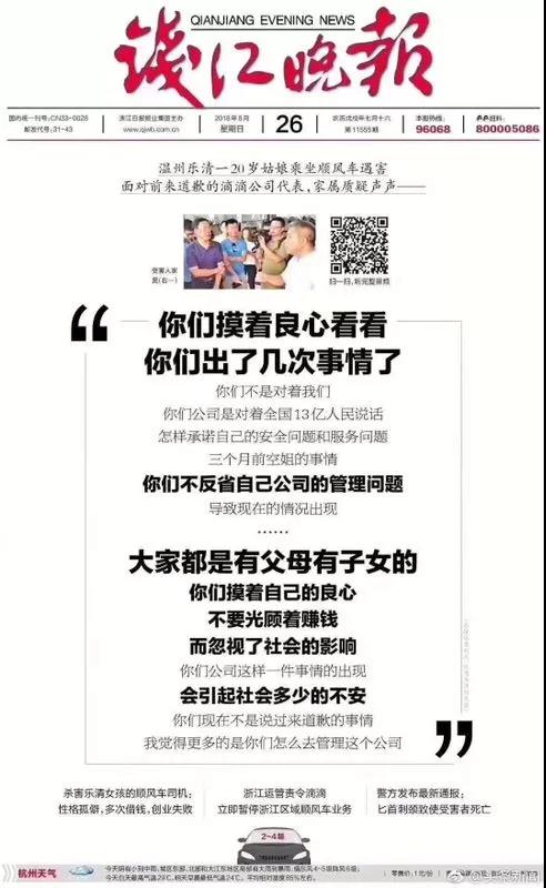 浙江媒体钱江晚报也在今天的头版头条向滴滴发问:
