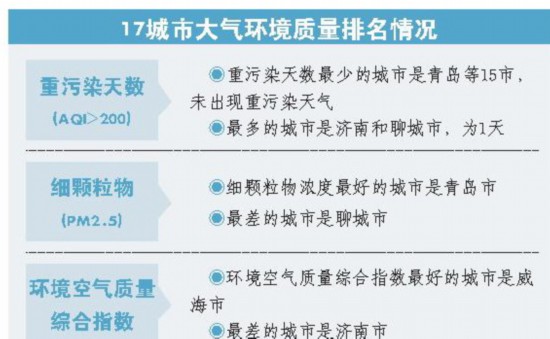 17市中,青岛等15市未出现重污染天气,济南和聊城市为1天。优良率最好的城市是青岛、烟台和威海市,为100.0%,最差的城市是滨州市,为29.0%。环境空气质量综合指数最好的城市是威海市,为2.06,最差的城市是济南市,为4.59。