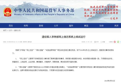 据退役军人事务部网站消息,该网站上“网上信访”“部长信箱”“纪检监察举报”等互动栏目已建设完成,将于9月1日上线试运行。