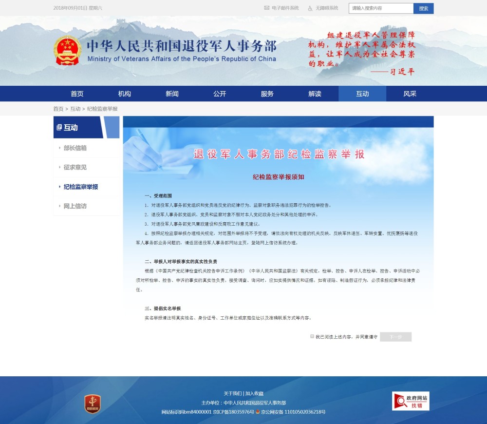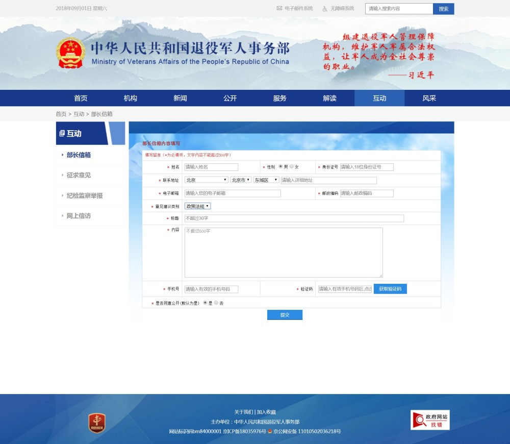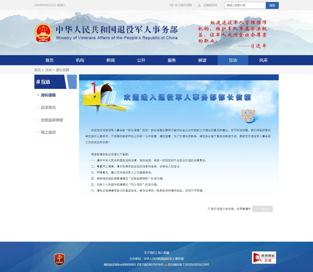 9月1日,退役军人事务部门户网站发布消息称,该部网上信访系统和门户网站“部长信箱”、“纪检监察举报”栏目已于当天上线试运行,“广大退役军人和其他社会公众可以直接通过互联网表达诉求、建言献策、反映情况”。