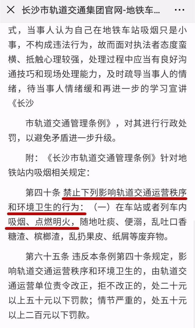 根据长沙市轨道交通管理条例,乘客有吸烟等影响轨道交通运营秩序和环境卫生的,由轨道交通运营单位责令改正,拒不改正的,处二十元以上五十元以下罚款;情节严重的,处五十元以上二百元以下罚款。
