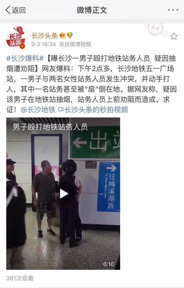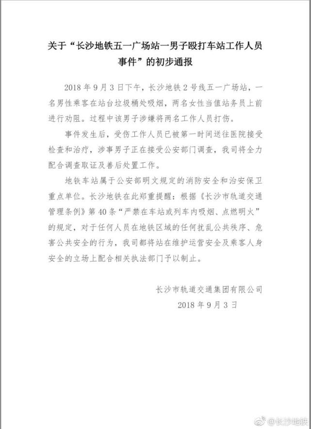 随后记者从长沙轨道交通了解到,芒果都市粉丝爆料属实,事发于今天(9月3日)下午2点多钟,长沙轨道五一广场站,一男乘客疑似因在站内违规吸烟,遭到站务人员上前劝阻,因此引发争执,目前被打两名女站务人员,已送往医院接受救治,打人男子也被长沙公交公安分局带走,正在接受警方调查处理。