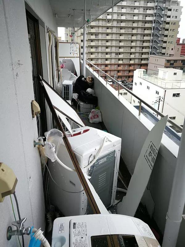 强烈的台风将宋先生家阳台上用于灾害和逃难用的隔板损坏,原本被三家住户隔断的阳台也被台风打通。受访者供图