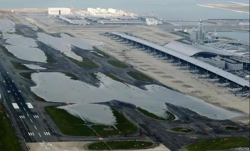 台风“飞燕”让大阪关西机场收到重创。这座经填海造地修建而成机场在4日的台风袭击中一度成为汪洋,停机坪等多处机场设施被水淹没而被迫关闭。