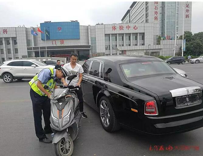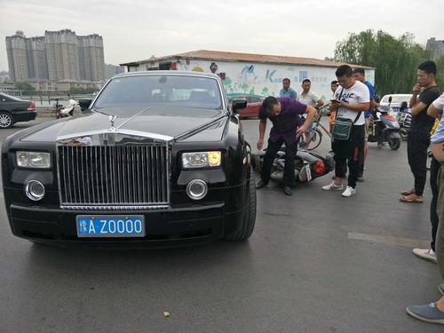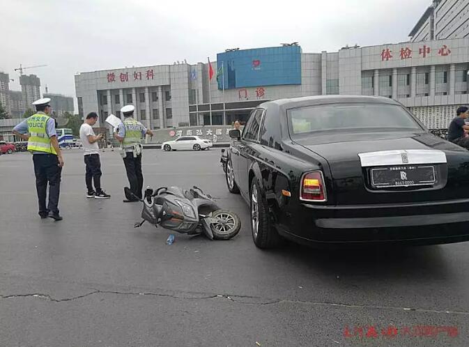 9月5日上午10点钟左右,在郑州市桐柏南路某医院门前,一辆豫A牌照劳斯莱斯幻影高级豪车,与一辆电动车发生事故,轿车车体受损不大,但修复价格不菲。电动车主惊厥抽搐,送医治疗。记者接报料赶至现场看到,一辆黑色劳斯莱斯幻影豪车,头西尾东,停泊在桐柏路东半幅车道。该车前左车门处,歪倒着一辆两轮电动车。劳斯莱斯幻影左车门处,三四道刮痕,清晰可见,甚至漏出底漆。从其运行轨迹判断,该车从东侧驶来,车头朝西南方向,司机意欲往左拐。来源:大河报