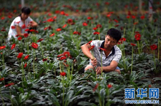 9月7日,贵溪市雷溪镇南山村杨祖连在采摘非洲菊,他在金土地农业专业合作社常年务工,2015年实现了脱贫。(新华社记者 宋振平 摄)