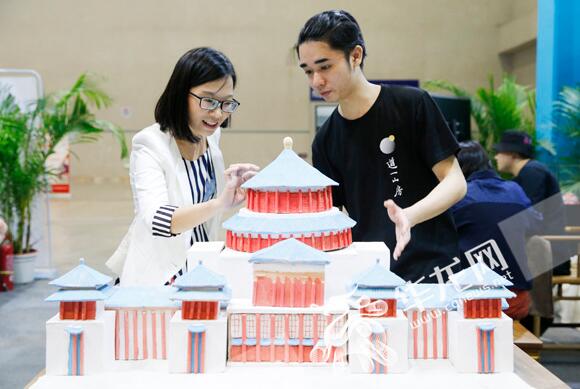 而这次参加文博会,李秉泽和他的同事还带来了一份特别的礼物,用传统技艺烧制出的重庆市人民大礼堂。“烧制过程相当不易。”李秉泽介绍说,首先要在墙上投影出重庆市人民大礼堂的影像,然后陶艺师要根据影像捏出大致的模型,然后再用一个多月的时间,把部件一个接一个的拼接起来,最终花了三天时间烧制出来。陶制的重庆市人民大礼堂一亮相,便吸引了众多市民的围观。