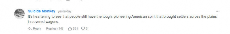 下面这位朋友站得更高。他说,令人振奋的是,美国人依然还保持着坚强、开拓的美国精神,当年,正是这种精神让拓荒者驾着大篷车驰骋于大草原。