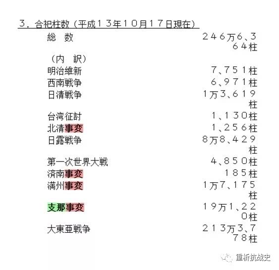 1.日方并没有完全停止统计自身战殁人数,以日方1937年至1941年太平洋战争爆发期间战殁者数字为例,在最之前,统计日本人数字为180978人,而后来再一次统计出来为185,647人。而靖国神社现今已经统计到了18.8万余人。