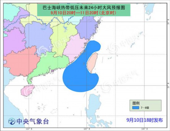 巴士海峡热带低压于今天(10日)上午8点钟生成,其中心位于海南省文昌市以东大约1180公里的海面上,就是北纬21.6度、东经121.9度,中心附近最大风力有6级(13米/秒),中心最低气压为1002百帕。
