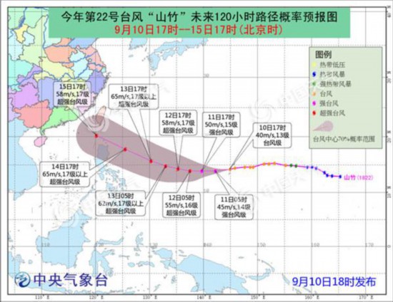 另外,今年第22号台风“山竹”(MANGKHUT)的中心今天上午8点钟位于美国关岛以东大约330公里的西北太平洋洋面上,就是北纬14.6度、东经147.6度,中心附近最大风力有13级(38米/秒),中心最低气压为965百帕,七级风圈半径150-350公里,十级风圈半径60-90公里,十二级风圈半径30-50公里。