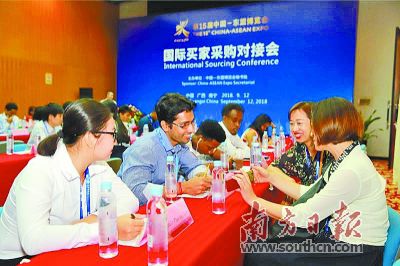 第十五届中国—东盟博览会开幕首日,国际买家在采购对接会上洽谈。赵晶文 摄
