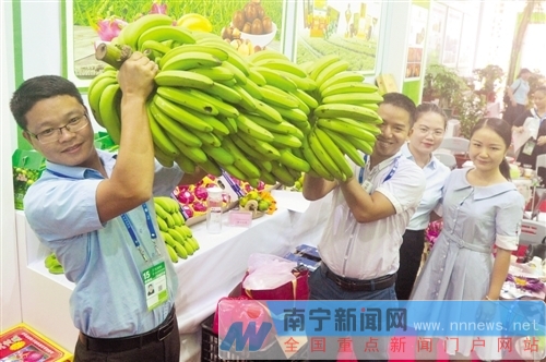 在广西水果特色优势展区,广西农垦集团展位上,一串100斤重的香蕉相当抢眼。香蕉个个饱满结实,两名展商花了好大力气才将它扛起来。一展商告诉记者,他来自广西农垦局国有龙北总场,位于龙州县。农场主要种植香蕉、柑橙、火龙果及澳大利亚坚果。现场不少客商品尝了他们的水果后,非常满意,正在进一步洽谈合作意向。