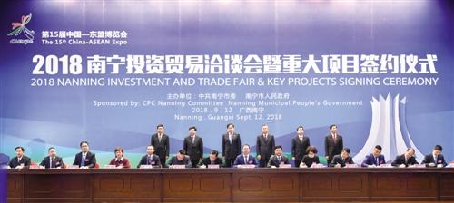 务实推动合作,携手共谋发展。9月12日,正值第15届中国—东盟博览会、商务与投资峰会举行之际,南宁市委、市政府举行2018年南宁投资贸易洽谈会暨重大项目签约活动,真诚推介南宁发展机遇、投资政策及投资领域,共建共享平台,实现合作共赢。