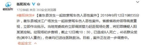 今晚,衡阳市网络新闻宣传管理办公室官方微博发布通报称,湖南衡东县城洣江广场今日发生一起故意驾车伤人恶性案件,截止12日晚10:30,已造成9人死亡,46名群众受伤。