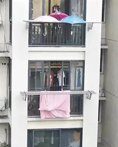 蓝色的、白色的、红色的——下雨了,楼下住户不在家,被子还晒在外面,浙江新昌县“锦绣华庭”小区四楼住户徐金兰在自家阳台的晾衣架上支起了三把伞。