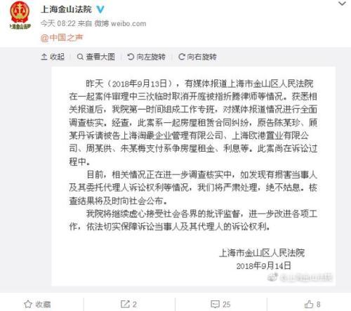 原标题:三次临时取消开庭被指折腾律师 上海金山法院回应