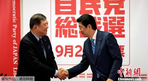 9月10日,日本自民党总裁选举联合发布会上,安倍和石破茂握手。