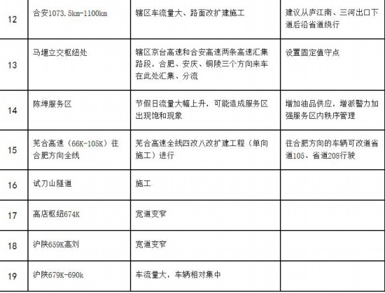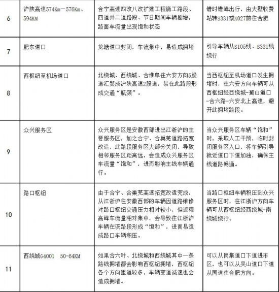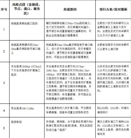 预计今年假期合肥市依然会延续往年群众出行率高、交通流量大的特点,在节日期间合肥市道路交通特别是商业繁华场所、旅游风景区、会展中心区域和高速公路将面临较大交通保障压力。节日期间合肥公安交警部门将切实加强节日期间道路交通管理工作,确保合肥市道路交通安全、畅通、有序,为广大人民群众欢度节日创造良好的道路交通环境。