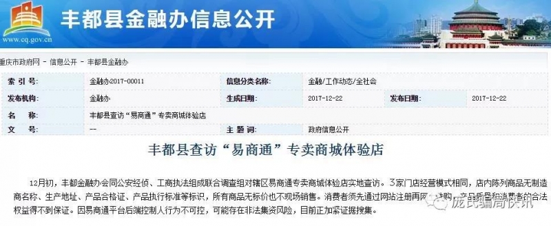 据丰都金融办网站公开信息显示,2017年12月份,丰都金融办会同公安经侦、工商执法组成联合调查组对辖区3家“易商通”专卖商城体验店实地查访。发现店内陈列商品无标价、无制造商名称、生产地址、产品合格证、产品执行标准等标识,属三无产品。所有商品也不现场销售。消费者须先通过网站注册再网上选购,产品质量和消费者的合法权益得不到保证。因易商通平台后端控制人行为不可控,可能存在非法集资风险。
