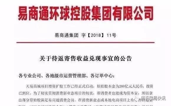 4月14日,“易商通”突然停止了对会员的返现,公司发布通知称,“天易商城”项目增资护股工作已经正式启动,原始股本金为200亿元投资已到位。会员在消费新业态或本地电商项目上有寄售待返余额的,可以申请用待返余额1:1置换“天易商城”的原始股权,每周分红哲停,如不选择置换“天易商城”原始股的会员,在三个月内返清。